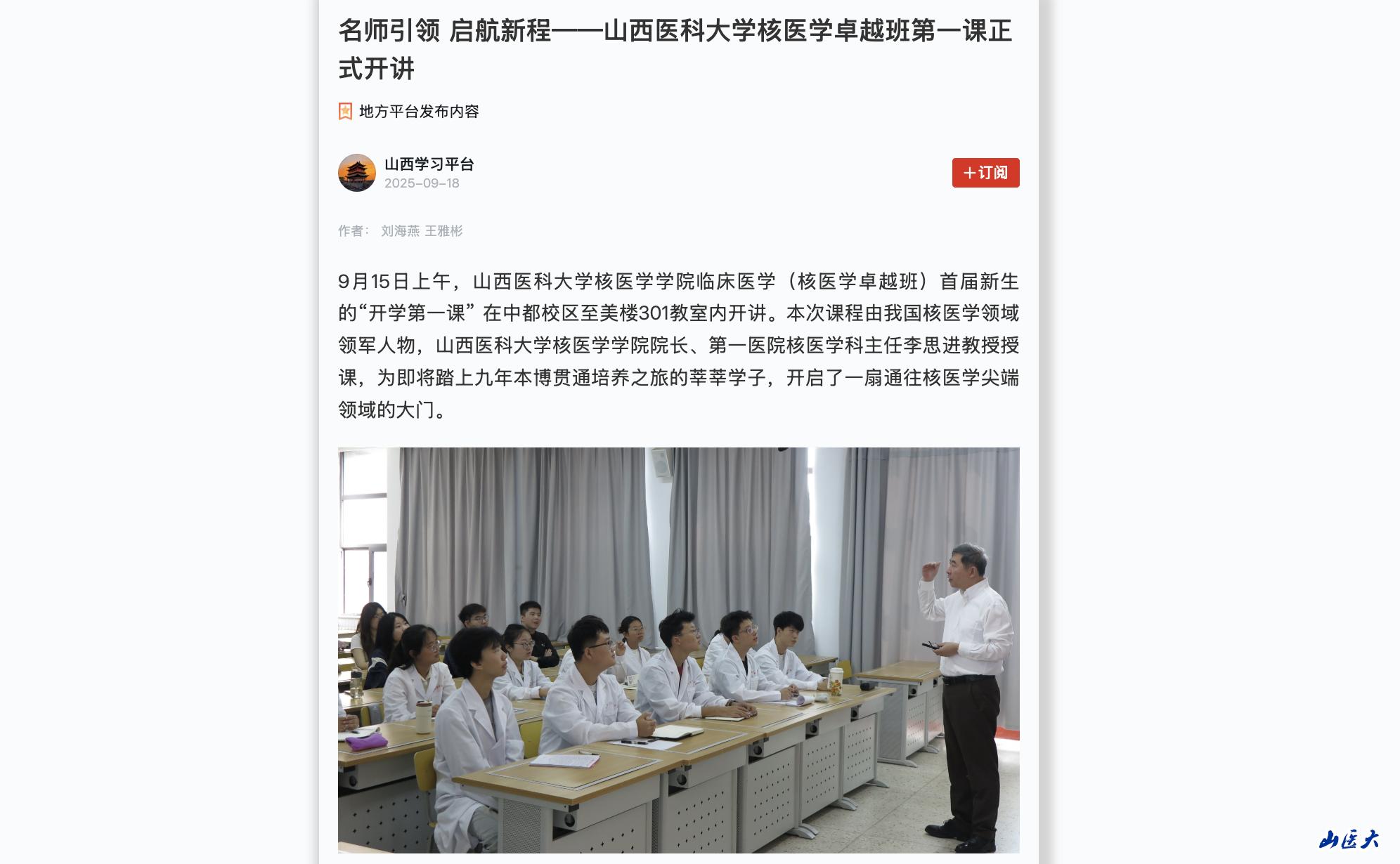 9月15日上午,我校核医学学院临床医学(核医学卓越班)首届新生的“开学第一课” 在中都校区至美楼301教室内开讲。本次课程由我国核医学领域领军人物,我校核医学学院院长、第一医院核医学科主任李思进教授授课,为即将踏上九年本博贯通培养之旅的莘莘学子,开启了一扇通往核医学尖端领域的大门。课程伊始,李思进教授以“核医学的学科地位与时代使命”为引,从世界核医学的起源讲起,逐步聚焦中国核医学的发展历程,带领同学们...