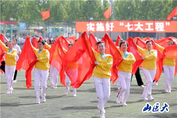 各单位整队退场后,大型文体展演“走进新时代、奋进新征程”开始。原山西省卫生厅党组书记、厅长李俊峰等校友代表接力传递着象征山医精神的“奋进之光”,展示着荣耀与传承。全校各院系参演人员、夕阳红舞蹈队、红石榴工作室、法医学院啦啦队、国际教育学院劲风鼓乐团和800余名师生员工的精彩表演将运动会开幕式的气氛再次推向高潮。