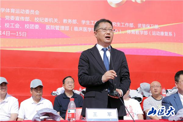 解军在开幕辞中指出,体育一直是德智体美劳“五育并举”的重要内容,是落实立德树人根本任务的重要途径。长期以来,学校以培养卓越医师为目标,不断提高体育教育水平,在体育课程改革、校园体育文化、学生体质健康、竞技体育等方面多点布局、全面开花。近年来,学校高度重视体育教育投入,大力支持开展全覆盖、高质量的体育活动,全面推行各项举措以提高学生健康水平,学生体质状况逐年提升。近三年,学校足球、篮球、排球、健美操等代表队,多次代表学校参加国家级及省级比赛并取得了骄人的成绩。这些成绩的取得,激励着更多的师生医护员工更加热爱体育,强身健体。六十重开新甲子,既是漫长的时间跨度,更是一个重要的里程碑时刻。本届运动会恰逢六十甲子,是有史以来规模最大、比赛场次最多、参赛单位最全的一次运动会,是所有山医人团结相聚的一次盛会。希望全体运动员、全体裁判员会坚持“友谊第一,比赛第二”的原则,以更快、更高、更强的体育精神投身比赛,赛出友谊、赛出公平、赛出水平。本届运动会一定能够办成精彩、团结、奋进的盛会,为早日建成全国一流研究应用型医科大学贡献青春力量和体育力量!