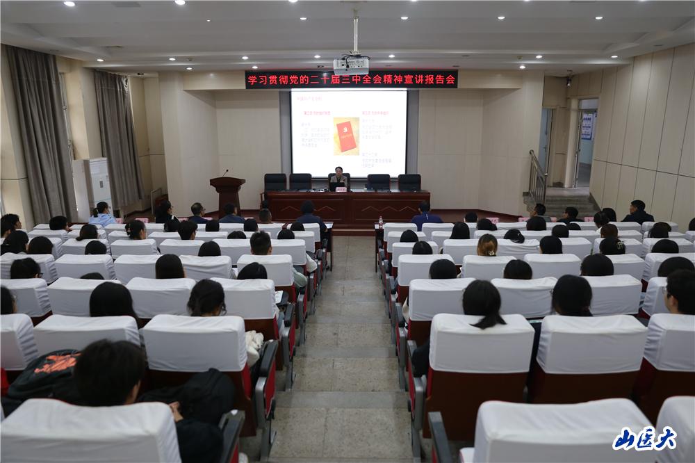 彭月兰以《学习贯彻党的二十届三中全会精神 做有为的时代新人》为题,从“学习内容”“为什么要学”和“如何学习”三个方面对党的二十届三中全会精神作了深入浅出的宣讲。她采用互动方式,以师生常见的线上线下购物税收问题及2024年度山西省科技重大专项计划“揭榜挂帅”为例,讲述进一步全面深化改革对推动中国式现代化的重大意义。通过一些基本概念的讲解,提升师生学懂《中共中央关于进一步全面深化改革、推进中国式现代化的决定》主要内容的能力。彭月兰强调,学习贯彻党的二十届三中全会精神,要厘清我国全面深化改革的历史脉络,融会贯通党的十一届三中全会、党的十八届三中全会、党的二十大和党的二十届三中全会的主要内容,深入领会新时代以来取得的历史性成就、发生的历史性变革。通过学习不断提升自身的政治能力。广大师生要把自身发展融入中国式现代化实践中,把职业发展同国家和社会需求相结合。既可以致力于生命起源这样的基础研究,也可以把解决医防协同这样的具体工作作为毕生的事业。紧跟时代步伐,努力成长为堪当民族复兴重任的时代新人。