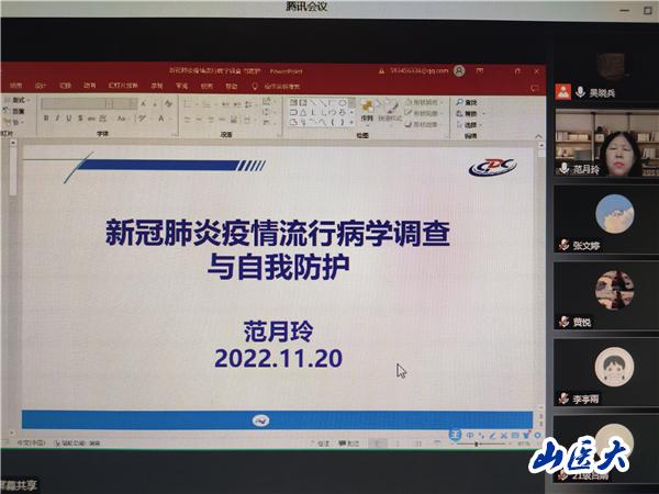为了保证志愿活动的高效率完成,提高志愿服务专业性,学校第一时间对援助校外疫情防控的志愿者们组织了培训。开学以来,校团委先后聘请山西省疾控结核病防治科科长范月玲、太原市疾控应急办主任郭慧芬、太原市新冠防控专家组成员车晓文和太原市疾控应急办副主任马彩凤对负责校内外的志愿者们分批次进行了线上培训。通过培训,传递了疫情防控专业知识,更点燃了志愿者们的奉献热情。专家们详细讲解了志愿活动过程中的工作建议,包括自我防护的重要性,防护服的穿脱顺序,流调工作中的相关注意事项等,志愿者们表示“对于目前的疫情有了更为清楚的了解,对于志愿活动中承担的责任也有了更为清晰的认知。”