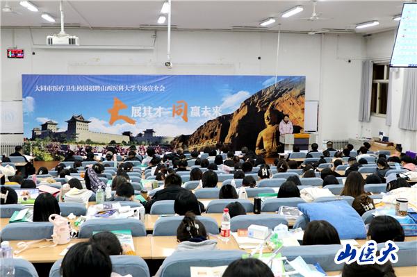 为深入开展2024年“书记校长访企拓岗促就业”专项行动,12月7日晚,我校在迎泽校区第二十二教室举办“大展其才·同赢未来”大同市校园招聘专场宣介活动。校党委副书记彭月兰,校党委常委、副校长刘春出席会议。大同市卫健委党组书记、主任纪青,大同市委组织部副部长郑天杰,大同市卫健委党组成员、副主任张晓琼,大同市第一人民医院党委书记闫莉,大同市第二人民医院院长范文有,大同市第三人民医院副书记董艳阳,大同市第四人民医院副院长崔模林,大同市第五人民医院党委书记尉杰忠、副院长郭胜,大同市中医医院院长卢杉等领导出席会议。校党委人才工作部、研究生学院党委、毕业生就业指导中心等相关部门负责人及200余名2024届应届毕业生参加会议。