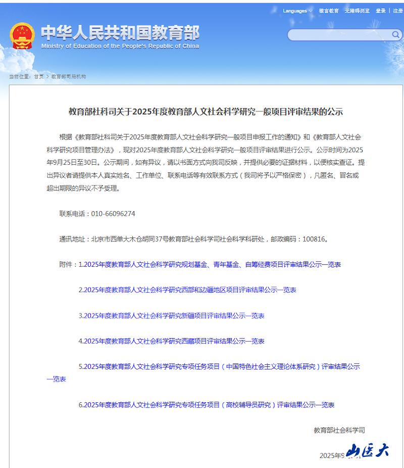 2025年度教育部人文社会科学研究专项任务项目(高校辅导员研究)评审结果公示,我校榜上有名