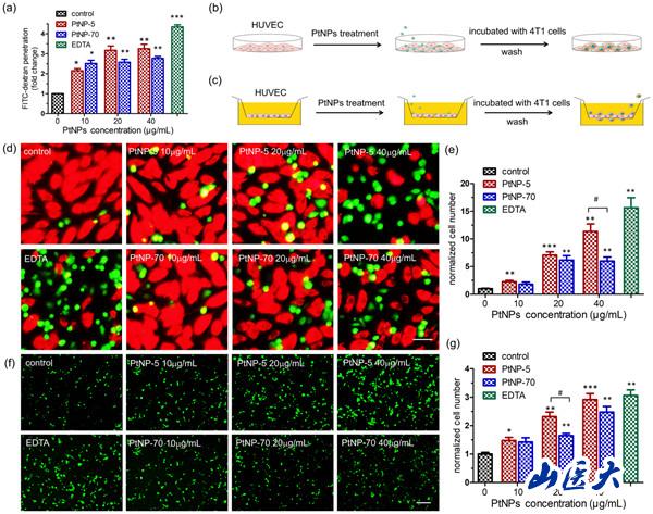 PtNPs由于具有良好的热稳定性和较高的光热转换效率,近年来在癌症光热治疗中受到了广泛的关注。PtNPs既可作为光动力和光热疗法的光敏剂,又可作为抗癌药物的载体。尽管目前认为PtNPs具有较好的抗癌作用,但其安全性仍有待评估。该研究发现,PtNPs可干扰血管内皮细胞的内皮钙粘蛋白(VE-cadherin)之间的相互作用,扰乱内皮细胞之间的连接,最终导致血管内皮渗漏,肿瘤细胞从原发肿瘤脱落,通过“内渗”方式进入血管,继而肿瘤细胞经血液循环在远达部位“外渗”出血管进入组织,形成转移灶。