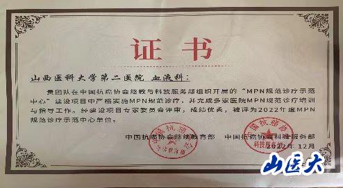 第二医院血液内科被评为2022年度全国MPN规范诊疗示范中心单位