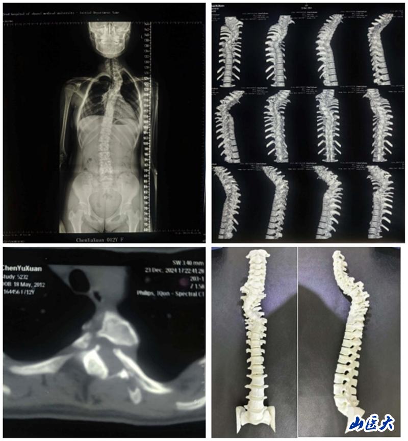 这位小姑娘自幼便全身布满咖啡斑,但因家庭贫困且对疾病认知不足,一直未进行详细检查。2024年7月,其祖母偶然发现孩子脊柱出现明显畸形,遂展开多方求医之路。在得知我校第二医院骨科脊柱畸形专业组薛旭红教授在脊柱侧弯治疗领域造诣颇深后,患者家属慕名而来,前往我校第二医院骨科门诊就诊。薛旭红凭借深厚的医学理论知识和丰富的临床经验,迅速诊断出患者为神经纤维瘤病所致的脊柱侧弯,并立即安排其住院治疗。进一步检查发现,患者因神经纤维瘤病导致椎体骨破坏严重,椎弓根细小,肋骨头变尖并凸入椎管内,手术难度和风险均极高。