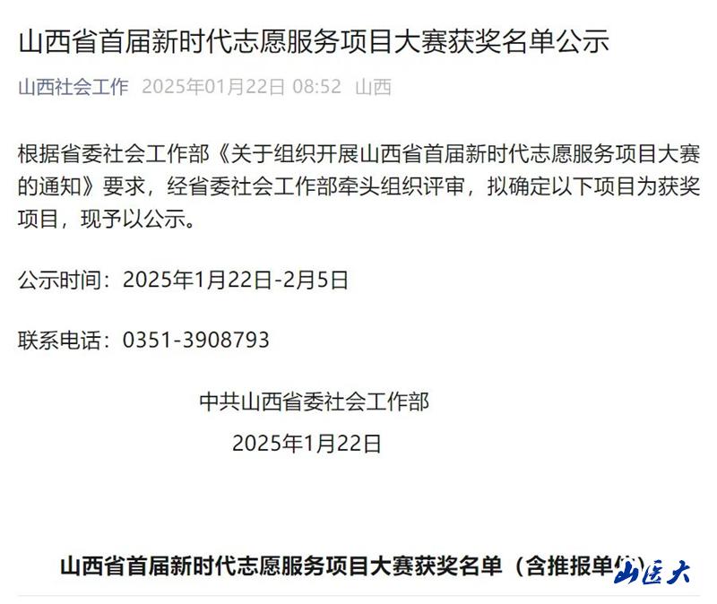 为推动全省志愿服务事业高质量发展,1月17日,山西省委社会工作部举办了全省首届各行各业新时代志愿服务项目大赛。第一医院的志愿服务项目“南丁格尔——‘救’在身边”荣获二等奖。