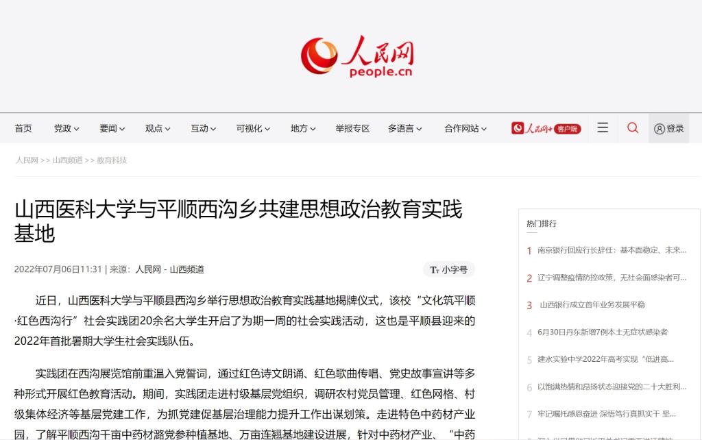 实践团在西沟展览馆前重温入党誓词,通过红色诗文朗诵、红色歌曲传唱、党史故事宣讲等多种形式开展红色教育活动。期间,实践团走进村级基层党组织,调研农村党员管理、红色网格、村级集体经济等基层党建工作,为抓党建促基层治理能力提升工作出谋划策。走进特色中药材产业园,了解平顺西沟千亩中药材潞党参种植基地、万亩连翘基地建设进展,针对中药材产业、“中药材+旅游”融合发展提出可行性建议。走村入户遍访当地群众,发挥自身优势,科普科学防疫、慢性病、中医、急救、儿科用药等医学知识,为村民提供更多医学常识,并开展义诊活动等。