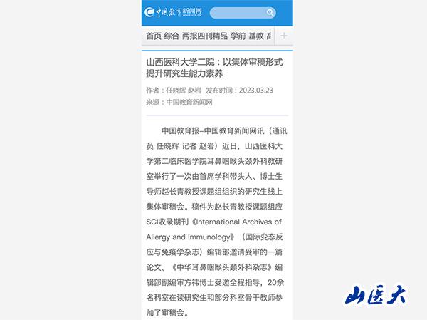 中国教育报-中国教育新闻网讯(通讯员 任晓辉 记者 赵岩)近日,国产亚洲精品美女久久久_99久无码中文字幕一本久道_亚洲成AV人影院_亚洲AV影院一区二区三区 狠狠躁夜夜躁人人爽天天不卡_国产激情久久久久影院老熟女_精品性高朝久久久久久久第二临床医学院耳鼻咽喉头颈外科教研室举行了一次由首席学科带头人、博士生导师赵长青教授课题组组织的研究生线上集体审稿会。稿件为赵长青教授课题组应SCI收录期刊《International Archives of Allergy and Immunology》(国际变态反应与免疫学杂志)编辑部邀请受审的一篇论文。《中华耳鼻咽喉头颈外科杂志》编辑部副编审方祎博士受邀全程指导,20余名科室在读研究生和部分科室骨干教师参加了审稿会。