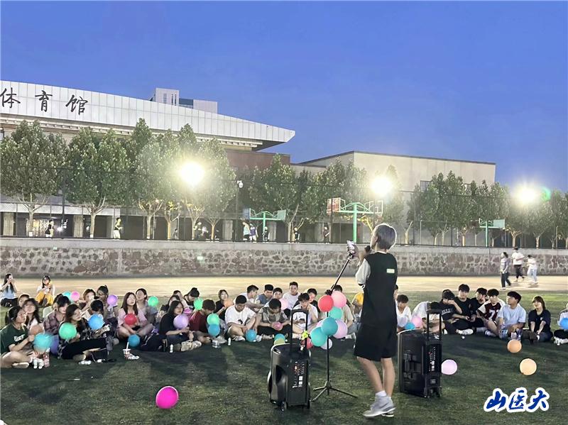 活动之初,辅导员王佳伟和学生张洤瑞共同组织在场学生参与“不倒森林”“一圈到底”“同心击鼓”等趣味游戏,让同学们在奔跑中、在互助合作中、在勇敢尝试中释放压力,增进同学间情感交流,增强团队合作意识和凝聚力。随着“一圈到底”分组比赛环节的结束,夏日音乐会拉开帷幕。