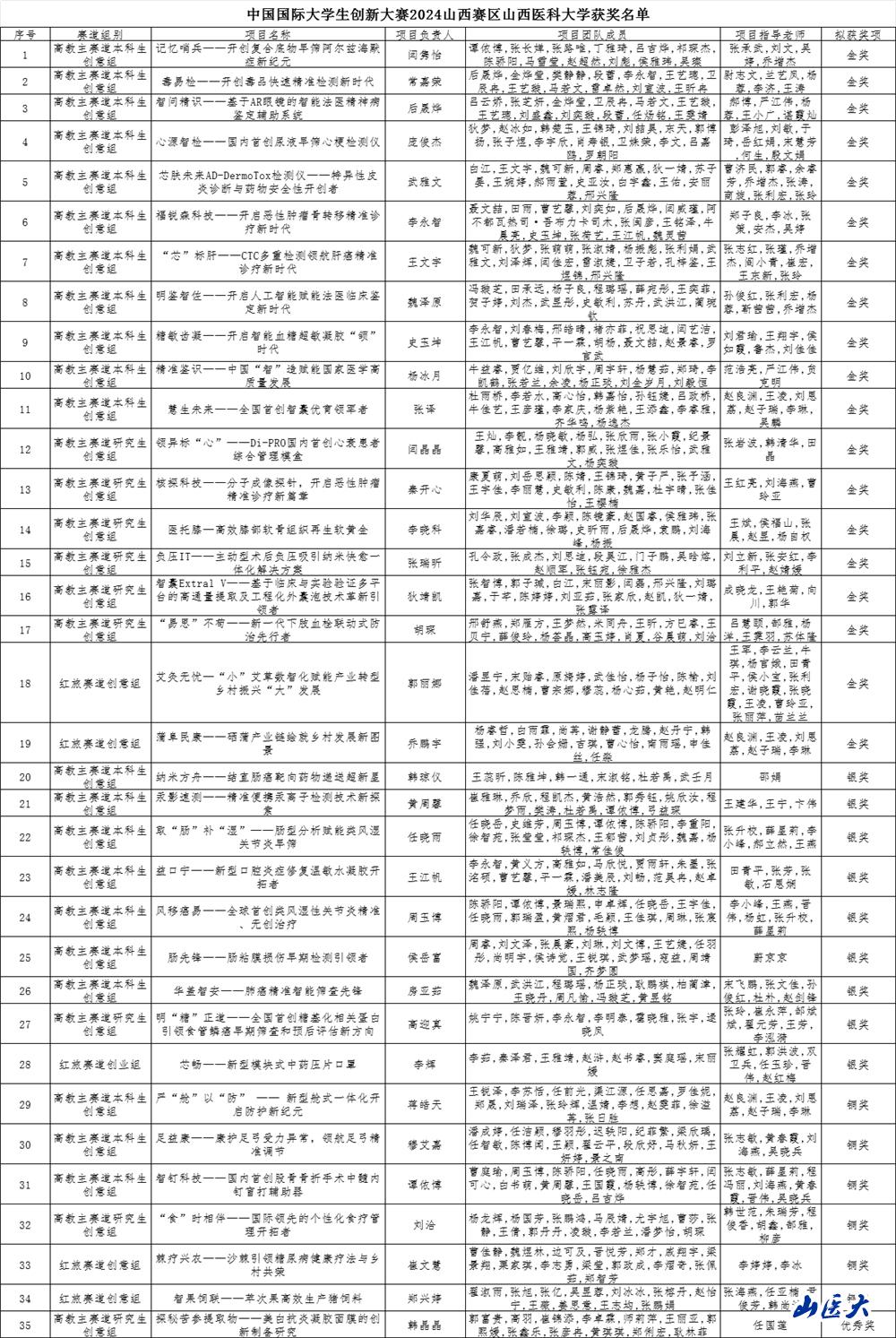 近日,山西省教育厅发布《关于公布中国国际大学生创新大赛(2024)山西赛区获奖名单的通知》(晋教高函〔2024〕24号),我校共获金奖19项、银奖9项、铜奖6项、优秀奖1项。其中主赛道金奖17项、“青年红色筑梦之旅赛道”金奖2项,获奖数量再创历史新高,展现了我校在创新创业教育领域的强劲实力。
