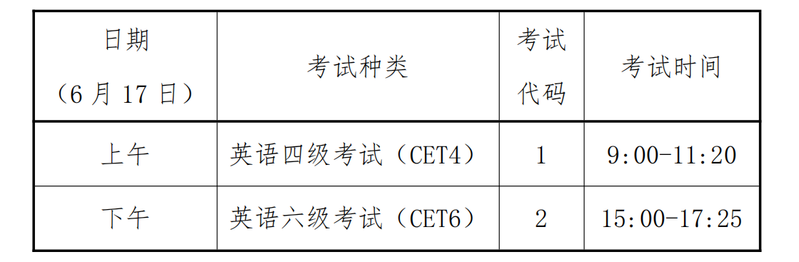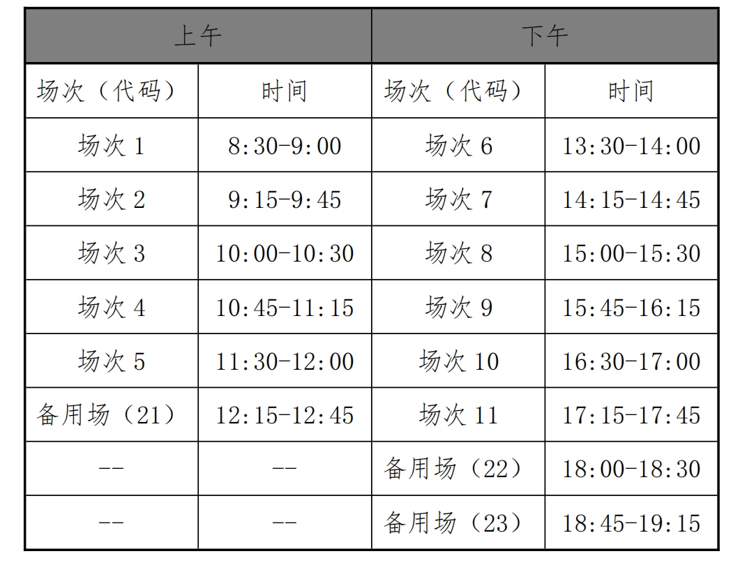 英语四级口语考试(CET-SET4)考试时间为5月20日(F221次),英语六级口语考试(CET-SET6)考试时间为5月21日(S222次),具体场次安排如下: