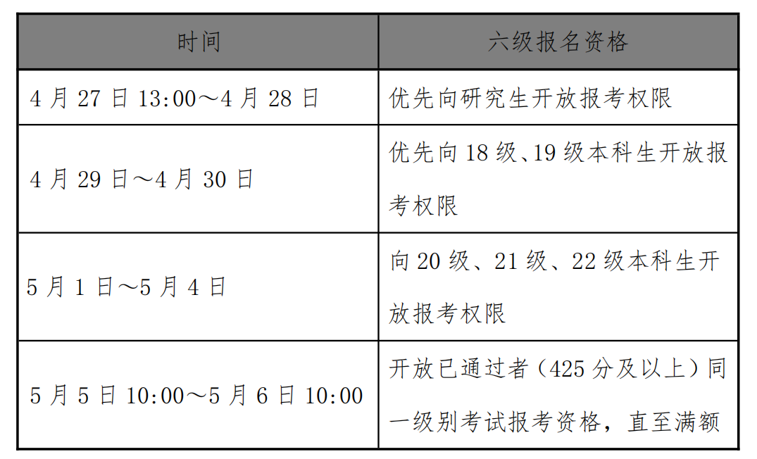 六级报考因需求较大,按照统筹兼顾、先急后缓的原则,分流限报、有序开放。优先开放报考权限的考生报考资格持续开放至5月6日10:00报名结束,直至教室容量满额。