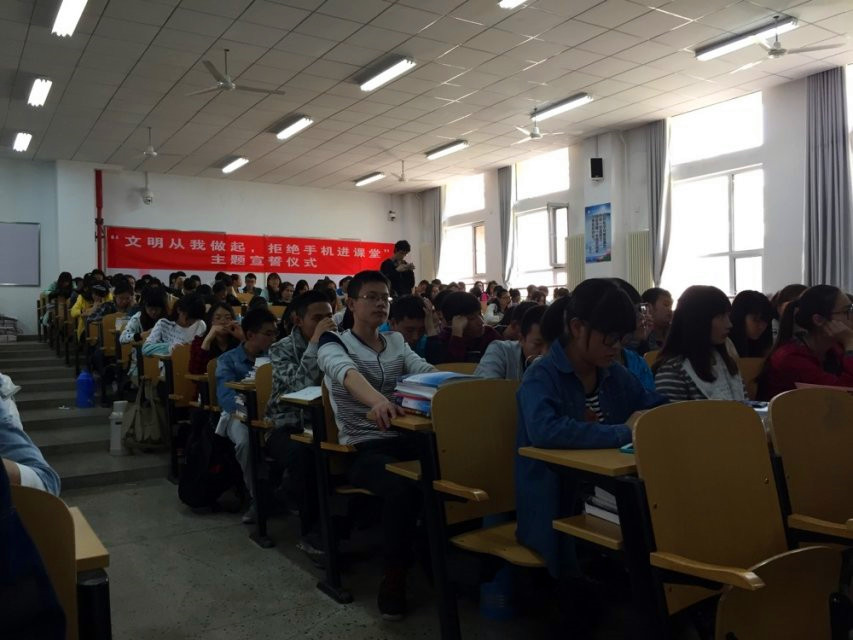 活动之初,口腔医学系学生会主席谢晶伟向全体同学宣读了倡议书,倡导大家从自我做起,拒绝手机进入课堂。随后以自编短剧和漫画的形式向全体同学发起倡议,倡导大家合理使用手机,文明上课。自编自导自演的正反两组情景短剧让同学们深刻体会到文明不仅是个人修养的体现,更是对他人的礼貌和尊重。漫画则向大家展示了生活中的“低头族”、“插队党”、“后排症”等一些不文明的现象。搞笑夸张的剧情和图片不仅仅引人发笑,更给大家带来了深思,文明就体现在我们身边的点滴小事中。仪式的最后,全体同学在“拒绝手机进入课堂”的大型条幅上郑重地签下了自己的名字。