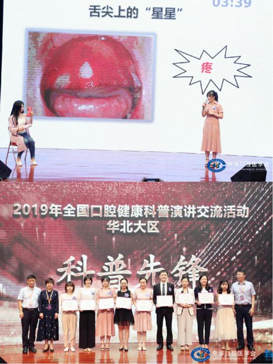 经过一番激烈的角逐,我院参赛选手刘卓卿凭借《女医卿妃传》荣获“科普精英”称号,她将种植牙知识以古装情景剧的形式进行了生动的演绎,给在场评委及观众留下了深刻的印象。选手史晓彤以“舌尖上的星星”为题,她将科普宣传的知识性与趣味性巧妙结合,通过情景问答的形式生动地讲述了口腔粘膜病相关知识,最终荣获“科普先锋”称号。