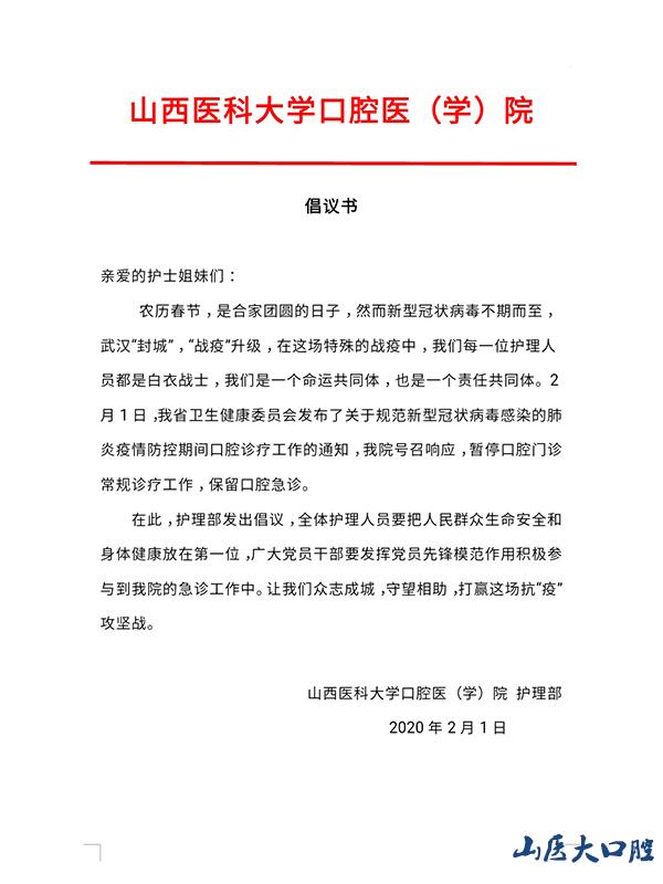 在实际工作中,王君同志深知当先锋、作表率的重要性,深明抗“疫”任务的严峻性,在明知疫情形式不够明朗的情况下,仍然主动请缨配合葛学军副院长外出社区给老人治疗,无畏危险,是团队的旗帜!上行下效,2月1日我院紧急下发战“疫”倡议书,全员护理人员主动请缨投身防控疫情第一线,希望与国家与武汉与我院共度难关。同舟共济,共赴危难,这就是团队的魅力!
