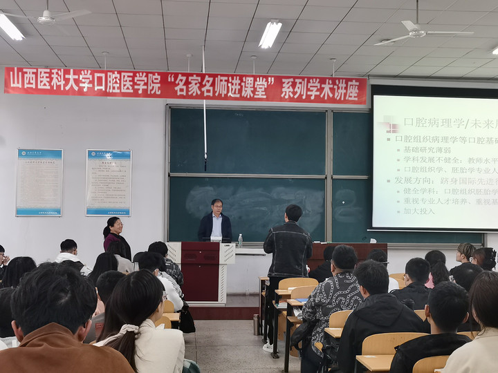 3月31日下午,我院继续开展“名师名家进课堂”系列学术讲座,邀请北京大学口腔医院高岩教授,在中都校区慎思楼C102作“口腔组织病理学的历史与未来”专题讲座。讲座由我院副院长张芳主持,2020级和2021级全体本科生到场聆听。