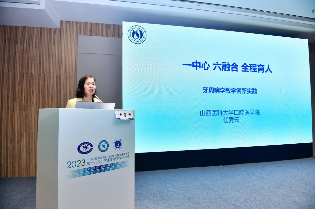 28日,任秀云书记在“一流课程”分论坛中做了《一中心六融合全程育人—牙周病学教学创新实践》的报告,具体分享了我院牙周病学教学过程中的痛点、创新举措及近年获得的教学成果等,对教学体系进行重新架构,突出我院牙周病学的教学理念即“一中心、六融合、全程育人”,对提升教学质量具有重要的参考意义,获得了在座专家的热烈掌声及一致好评。