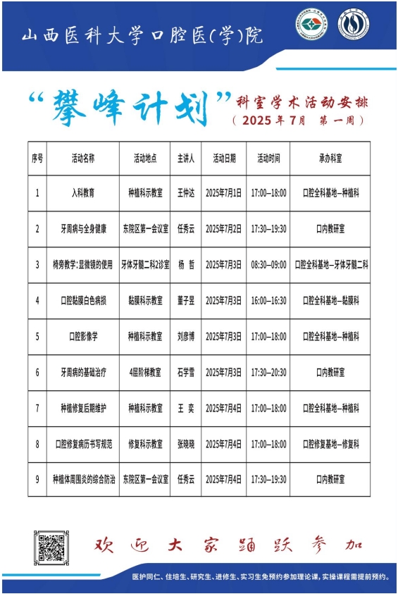 本月活动亮点纷呈,融合多元学术与实践内容:特邀省内外专家开展博士中期考核交流研讨,2023级博士分享优秀开题经验,2024级博士进行首次开题汇报;日常教学活动丰富,涵盖科室常见牙周问题小讲课、椅旁带教、疑难病例研讨、数字化教学及显微镜使用专项指导,另设牙周病学精品理论课程。诚邀院内外口腔医护同仁莅临交流!
