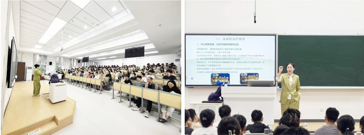 帮扶期间,聂敏副教授在东院区1号楼6教室为本科生讲授《牙体牙髓病学》第十三章“深龋治疗与盖髓术”教学示范课。她巧妙运用多媒体教学手段,将深龋的诊断标准、治疗原则及操作要点生动呈现,并设计互动环节引导学生主动思考。本次示范课充分展现了以学生为中心的教学理念,为我院教师改进教学方法提供了优秀范例。