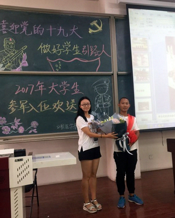 9月13日,口腔医学系(口腔医院)在新校区笃行楼B座101教室举办了“喜迎党的十九大,做好学生引路人”大学生参军入伍欢送会。系(院)党总支副书记殷凤、辅导员吴婷和2016级口腔医学系全体同学参加了欢送会。