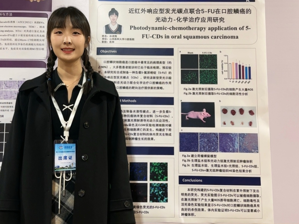 此外,我院2022级专硕研究生孙凌翔的研究成果《近红外响应型发光碳点联合5-FU在口腔鳞癌的光动力-化学治疗应用研究》参与壁报展示,被评为优秀作品。