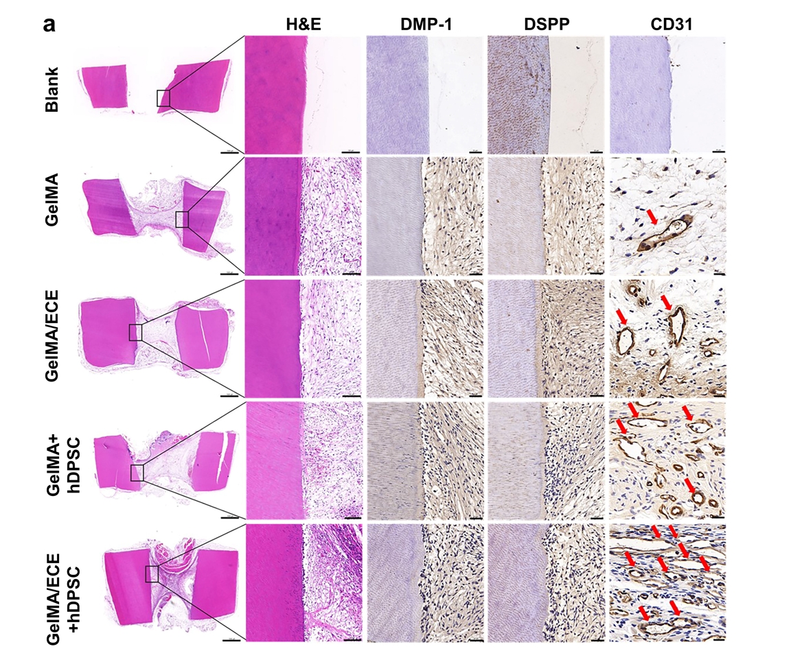 武秀萍教授团队以中药杜仲为碳源合成的具有促成骨作用的杜仲碳点EUO-CDs与具有抗炎、促血管生成功能的表没食子儿茶素没食子酸酯(EGCG)结合,组装成一种新型纳米材料EUO-CDs-E(ECE),研究其体外细胞毒性,确定了ECE的最适宜浓度为100 µg/mL,并以可注射、可光交联的甲基丙烯酰化明胶(GelMA)作为生物支架材料,制备了GelMA/ECE新型水凝胶,对该水凝胶进行理化特性的表征研究,并通过体内外实验证明了该水凝胶具有良好的生物相容性和促进牙髓-牙本质复合体再生的潜能,为其在牙髓再生领域的进一步应用提供理论基础。