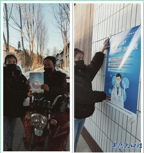 口腔医学院共青团员、2018级临床口腔医学研究生南晓茹,作为山西省运城市新绛县古交镇下船庄村志愿服务队的一员,负责宣传劝说街上行人非必要时不要出门,且出门戴口罩,为村民发放抗击疫情手册、张贴抗击新型冠状病毒宣传画等工作。