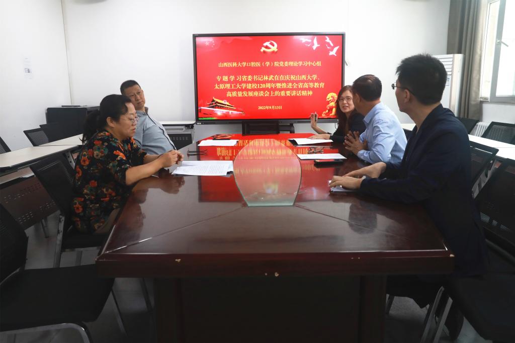 9月13日上午,口腔医(学)院党委理论学习中心组在科教楼215会议室召开扩大会议,专题学习省委书记林武在庆祝山西大学、太原理工大学建校120周年暨推进全省高等教育高质量发展座谈会上的讲话精神。院领导班子成员参加会议,院党委书记任秀云主持会议。
