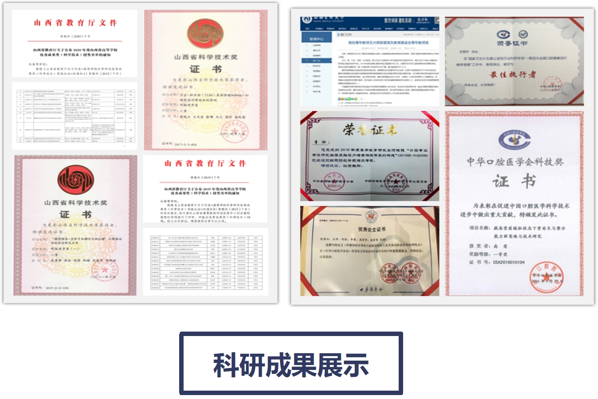 学科围绕国家重大战略和经济社会发展需求,紧扣全国口腔健康事业发展步伐,瞄准多学科交叉科技前沿,扎实开展口腔疾病诊疗领域的创新性基础研究和应用研究。学科高度重视科学研究,不断深化医教研协同创新,为研制具有自主知识产权的新型口腔材料及设备提供了理论依据及前期基础,为健康中国、健康山西建设提供了有力的智力、人才和技术支撑,切实推动了山西口腔健康事业的高质量发展。