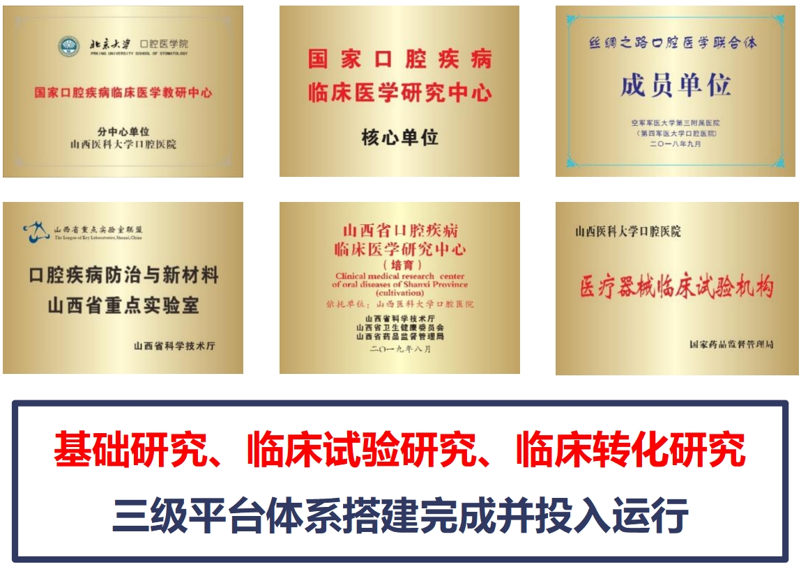 学科现为山西省重点建设学科、山西省医学重点学科,2019年立项建设山西省口腔领域唯一省级平台“口腔疾病防治与新材料山西省重点实验室”并于2023年1月顺利通过验收;2020年完成医疗器械临床试验机构备案;2022年获批成立山西省口腔疾病(颌面部畸形)临床医学研究中心,基本建成从基础研究、转化研究到临床试验的全过程科研服务平台,拥有口腔医学博士后创新实践基地、口腔疾病防治与新材料山西省重点实验室、国家口腔疾病临床研究中心(核心单位)等10个国家级、省级平台,总面积达4万平米,设备总值18620余万元,拥有完备的材料性能检测设备:主要包括激光共聚焦显微镜、流式细胞仪、硬组织切磨系统、骨形态分析测量系统、3D生物打印系统、实时无标记细胞分析系统、万能材料试验机、流变仪、傅里叶变换红外光谱仪、紫外分光光度计、场发射扫描电子显微镜、透射电子显微镜、超高速离心机、活细胞工作站、激光共聚焦显微镜(材料)、zeta电位仪等,为口腔生物材料的研发及口腔疾病防治基础研究提供更为完善的保障。