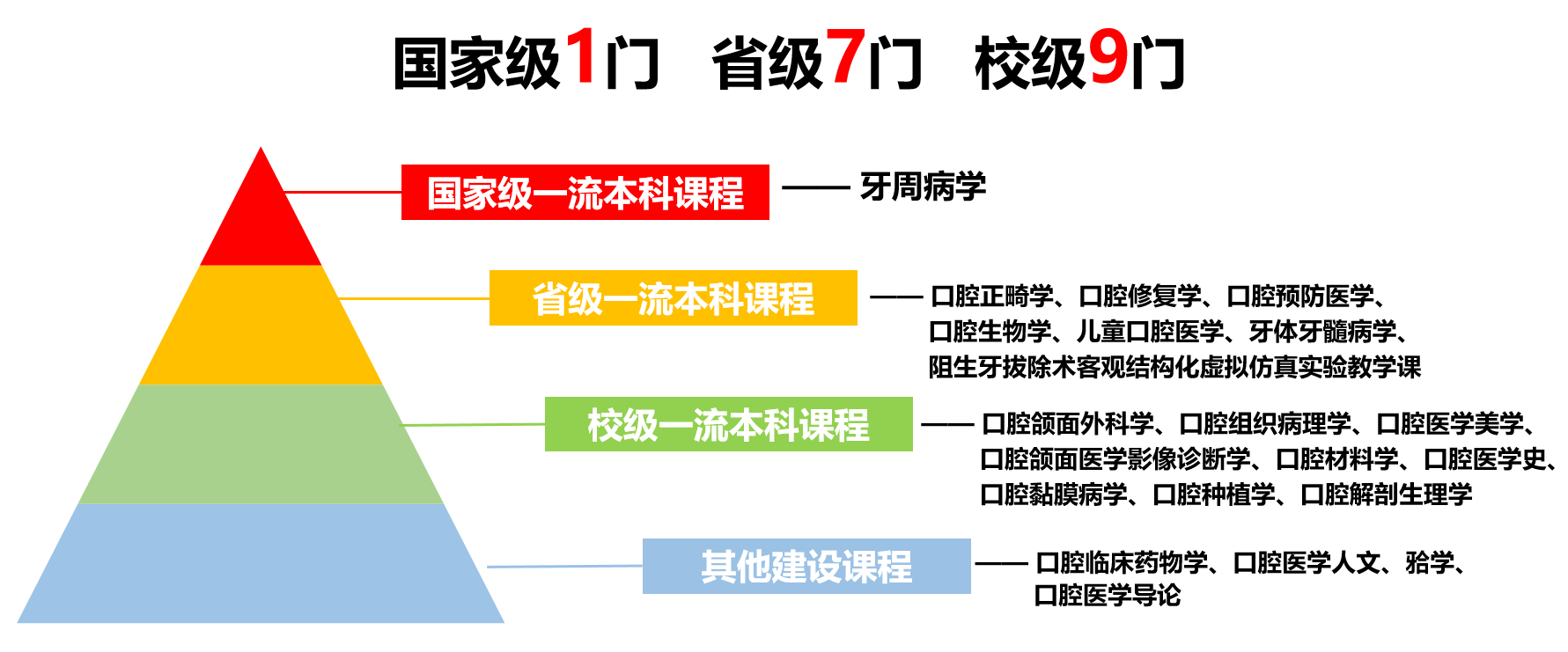 一流本科课程建设成效显著:通过系列日常教学活动、培训及比赛等持续建设,学院《牙周病学》获批2023年度国家级线上线下混合一流本科课程,形成了由1门国家级一流课程领衔,7门省级一流课程助力,9门校级一流课程支撑全面覆盖口腔医学专业主干课程的精品课程体系。