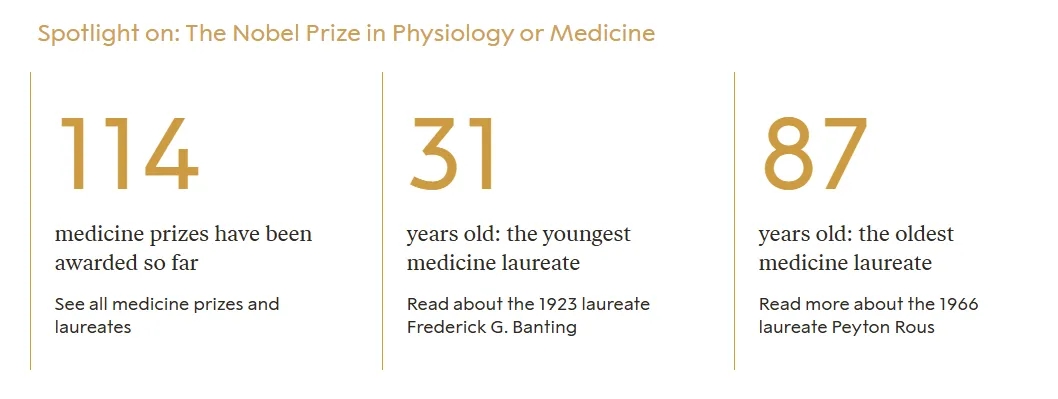 最年轻的获奖者是加拿大科学家弗雷德里克·班廷(Frederick G. Banting),1923年因“发现胰岛素”获奖,时年31岁。