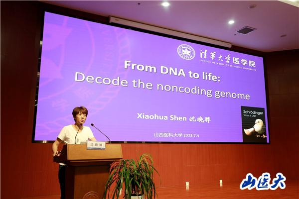 沈晓骅以《From DNA to Life: Decode the noncoding genome》为题,介绍了探索非编码基因组影响转录和染色质结构的新模式,从独特视角认识发育和干细胞分化中细胞命运决定的普适性规律。包括揭示非编码RNA顺式调控邻近转录和染色质构象;揭示基因组折叠的基层规律,提出转座子重复序列(L1 和 B1/Alu)是染色质三维大尺度结构形成的遗传分子基础;RNA结合蛋白通过相分离反馈调控转录和染色质状态。向烨以《病原微生物研究-从临床到基础分别》为题,分享了近年来人类重大病毒性传染病的爆发及流行,介绍了其团队聚焦于病原微生物结构,致力于研究病毒入侵及组装分子机制,并基于结构开发生物药物及疫苗。报告视野宽阔、内容丰富、生动详实、深入浅出,为我校师生奉献了一场精彩纷呈的学术盛宴。