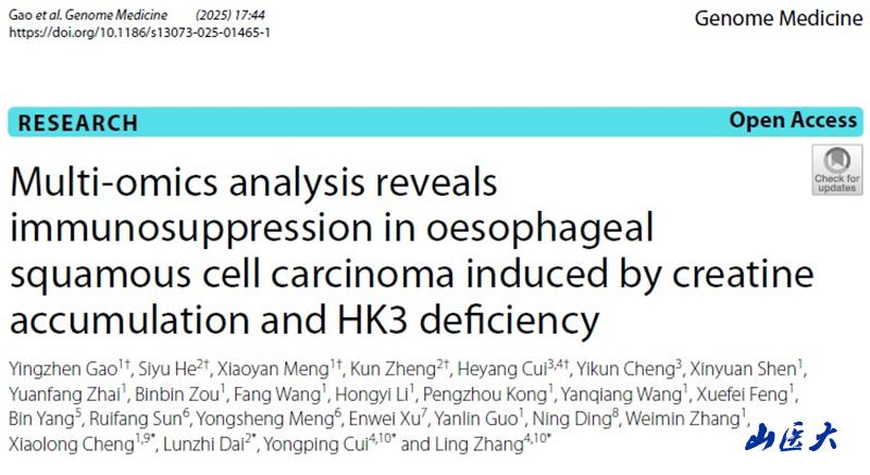 近日,我校细胞生理学教育部重点实验室、基础医学院食管癌发病机理及临床转化研究所联合四川大学华西医院在国际期刊《Genome Medicine》(中国科学院一区TOP期刊,IF=10.40)发表了题为“Multi-omics analysis reveals immunosuppression in oesophageal squamous cell carcinoma induced by creatine accumulation and HK3 deficiency”的论文。我校博士生高迎真为第一作者,张玲教授、崔永萍教授、成晓龙教授为共同通讯作者。