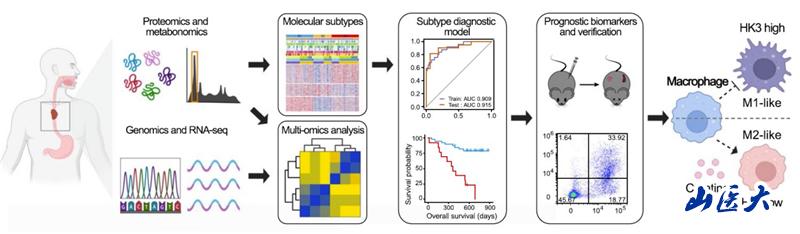 研究人员通过对ESCC的代谢组学和蛋白质组学分析,详细描绘了ESCC中的蛋白-代谢景观,并结合先前的基因组和转录组数据,丰富了ESCC的分子特征。进一步基于蛋白质组学和代谢组学鉴定出三个代谢-免疫特征显著差异的亚型(S1、S2和S3),并开发了亚型预测模型。S3亚型表现出最差的预后,其免疫微环境显著抑制,表现为M2型肿瘤相关巨噬细胞(TAMs)浸润增加,而CD8+T细胞、CD4+T细胞和NK细胞浸润减少。肌酸累积和己糖激酶3(HK3)蛋白表达降低是S3型的两个特征。研究人员随后通过动物实验和细胞实验发现,肌酸累积与HK3降低可能介导一种能量转化,二者通过重编程TAMs的能量代谢,协同驱动TAMs向M2型极化,重塑ESCC免疫抑制型微环境。