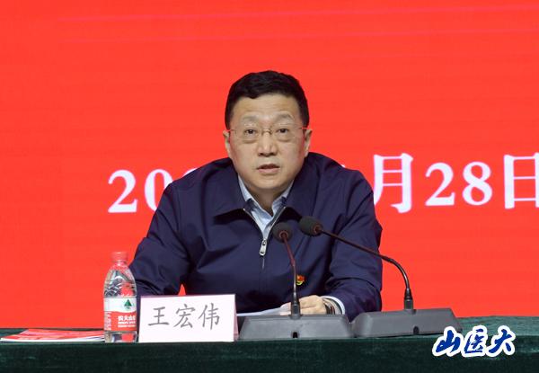 王宏伟在讲话中对第二医院党史学习教育工作和取得的成果给予了高度肯定和评价。他指出,党史学习教育开展以来,第二医院把开展好党史学习教育作为重大政治任务,认真贯彻中央和省委、校党委的统一安排部署,把党史学习教育与“我为群众办实事”实践活动深度融合,取得了显著成效。一是在感悟“两个确立”上更加坚定。医院坚持中心组集体交流学、举办专班系统学、深入实践体验学、邀请专家辅导学、及时跟进重点学,团结带领医院医护党员和师生坚决捍卫“两个确立”,不断增强“四个意识”、坚定“四个自信”、做到“两个维护”。二是在用党的创新理论指导实践上更加坚决。全体党员坚决落实立德树人根本任务,坚持党要管党、全面从严治党和稳中求进的工作总基调,在疫情防控常态化的形势下,扎实开展党史学习教育。三是在为群众办实事上更加自觉。医院充分发挥医疗专业优势,坚持公立医院的公益性,赋予党史学习教育鲜明的“专业特色”,拿出实招硬招,聚焦群众就医“急难愁盼”解难事。就医院巩固拓展党史学习教育成果,他要求,一要坚持厚植思想根基,深入落实十九届六中全会精神,坚决捍卫“两个确立”;二要坚持落实立德树人根本任务,将医院人才队伍建设与为党育人、为国育才深度融合;三要坚持人民至上、生命至上的发展理念,将现代化医院建设与“我为群众办实事”实践活动深度融合。