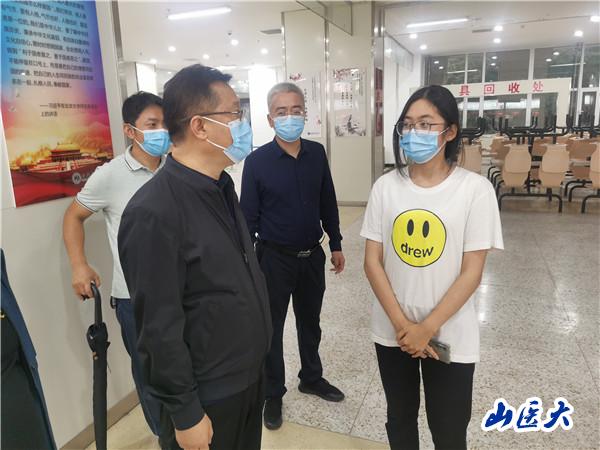 在第一食堂,王军同师生们亲切交谈,详细询问了静态管理期间学习、工作、生活等情况,对同学们密切配合学校静态管理、严格遵守防控规定、在宿舍潜心学习表示感谢,对食堂员工克服困难保供给、调换花样保餐饮、不辞辛苦保服务的敬业精神表示赞赏。“吃得好不好?”“吃得饱不饱?”“还有啥意见没?”每到一处,他都耐心与同学们交流、征求意见。解军仔细询问了餐厅菜品安排,了解了口味口感、荤素搭配、装盒打包、分发配送等工作情况。他要求,餐饮要每日合理搭配,量足、口味好,规范操作,切实做好食品卫生安全。