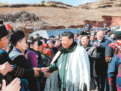 三河村平均海拔2500多米,是一个彝族贫困村。习近平沿着石板小路步行进村,察看村容村貌和周边自然环境。他先后走进村民吉好也求、节列俄阿木2户贫困家庭看望,详细观看门前的扶贫联系卡,同主人亲切拉家常,询问生活过得怎么样,发展什么产业,收入有多少,孩子有没有学上。他饶有兴趣地听10岁小女孩吉好有果唱《国旗国旗真美丽》,并带头鼓掌。在村民节列俄阿木家,习近平同村民代表、驻村扶贫工作队员围坐在火塘边,一起分析当地贫困发生的原因,谋划精准脱贫之策。大家用朴实生动的语言表达了见到总书记的喜悦和幸福,畅叙了党和政府对彝族同胞的关怀关爱,述说了脱贫攻坚行动给乡亲们带来的大量实惠,人人都边说边激动得流泪。习近平饱含深情地说,我一直牵挂着彝族群众,很高兴来到这里,看到大家日子一天天好起来,心里十分欣慰。得知近年来村里大力发展种养业,引进优良品种的牛猪羊,家家户户种植了马铃薯、核桃、花椒,农民收入持续增加,习近平十分高兴。他强调,发展特色产业、长期稳定致富,都需要人才。要培养本地人才,引导广大村民学文化、学技能,提高本领,还要移风易俗,通过辛勤劳动脱贫致富。习近平指出,我们搞社会主义,就是要让各族人民都过上幸福美好的生活。全面建成小康社会最艰巨最繁重的任务在贫困地区,特别是在深度贫困地区,无论这块硬骨头有多硬都必须啃下,无论这场攻坚战有多难打都必须打赢,全面小康路上不能忘记每一个民族、每一个家庭。