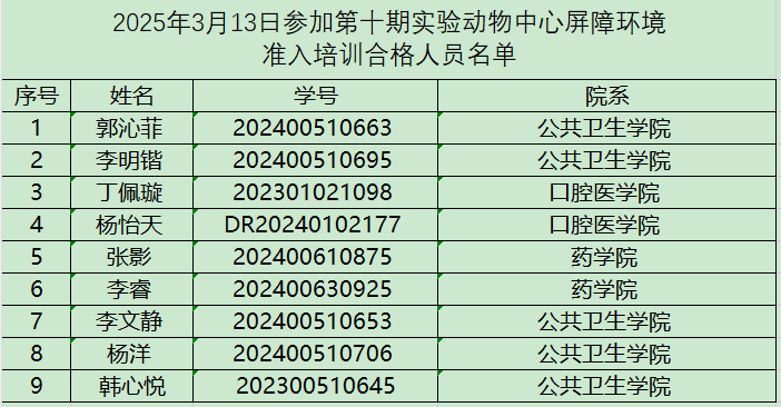 第十期屏障环境准入培训合格人员名单-实验动物中心