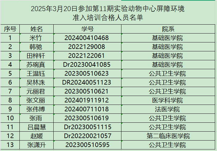 第11期屏障环境准入培训合格人员名单-实验动物中心