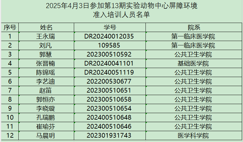 2025年4月3日参加第13期屏障环境准入培训人员名单-实验动物中心
