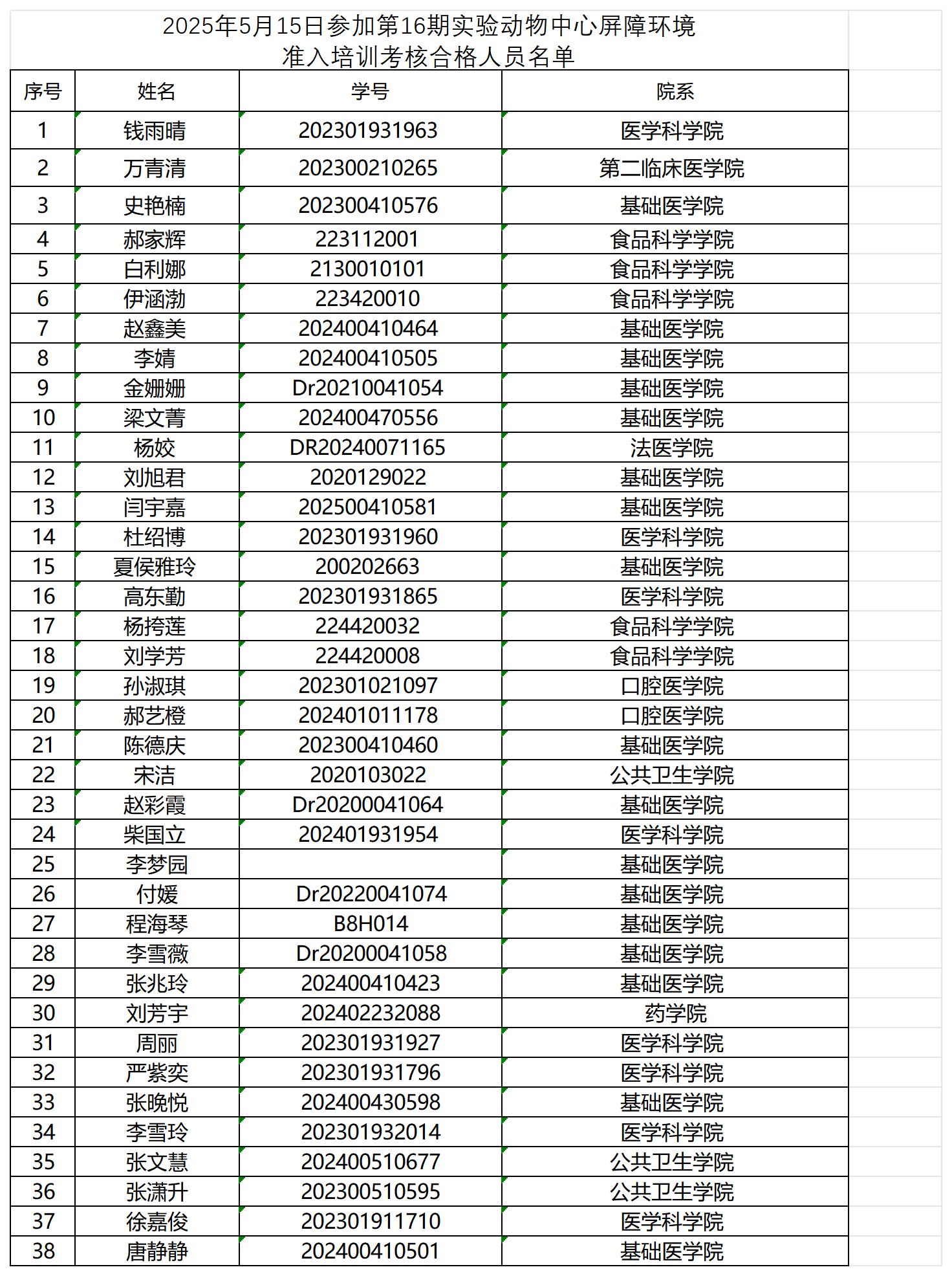 第16期屏障环境准入培训合格人员名单-实验动物中心