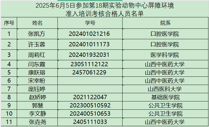第18期屏障环境准入培训合格人员名单-实验动物中心