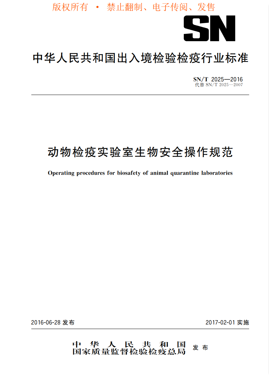 SN-T 2025-2016 动物检疫实验室生物安全操作规范-实验动物中心