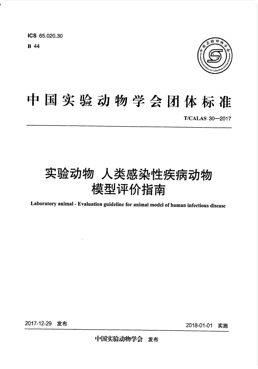 T-CALAS 30-2017 实验动物 人类感染性疾病动物模型评价指南-实验动物中心