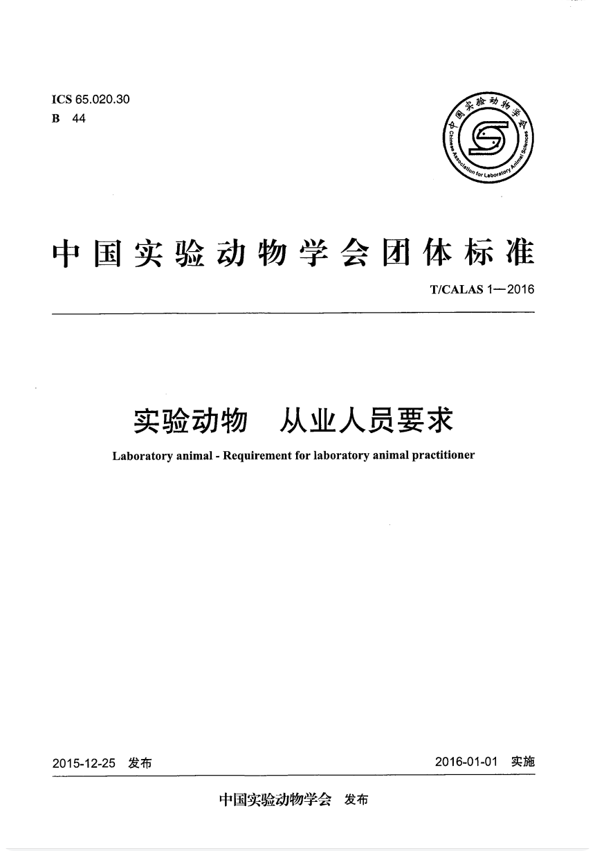 T-CALAS 1-2016 实验动物 从业人员要求-实验动物中心