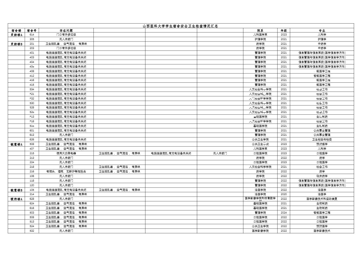 为进一步加强我校学生宿舍安全管理工作,消除各类安全隐患,增强学生的安全防范意识,培养学生良好的生活习惯,创造良好的育人环境,确保学校安全稳定发展。由学生工作部联合研究生学院党委、保卫部、后勤保障部于523日下午在中都校区对学生宿舍进行了安全卫生大检查。针对此次检查中存在的问题,各学院(系、部)需予以高度重视,并组织辅导员深入宿舍,核查情况,及时整改,以消除安全隐患。具体检查情况汇总如下: