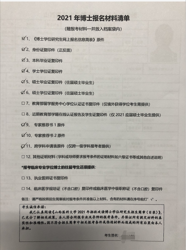 考生完成网上报名并确定报名志愿后,按照清单列表将个人报考材料统一装入自备的档案袋内(见图例1、2)。研招办将在考生提交材料后进行审核。
