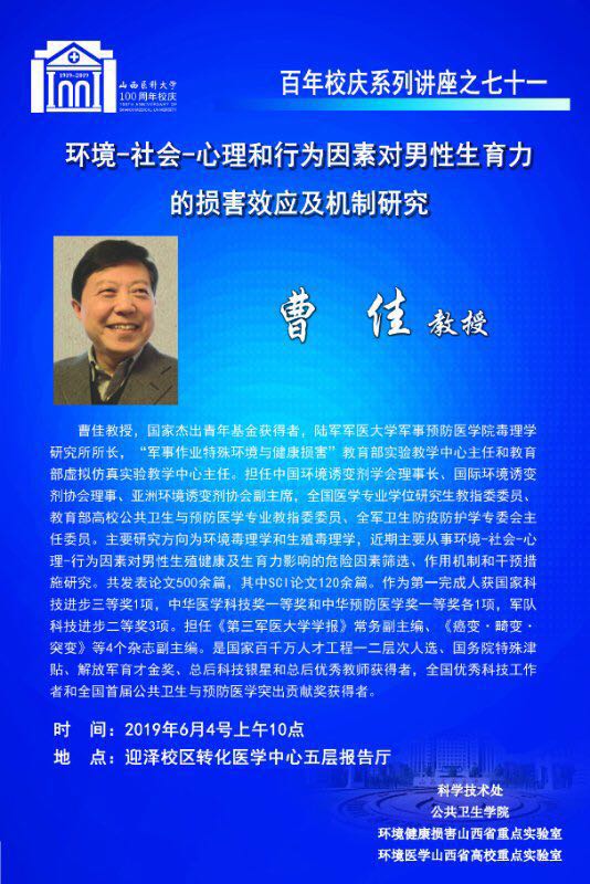 曹佳教授——环境—社会-心理和行为因素对男性生育力的损害效应及机制研究
